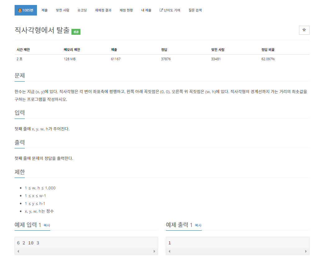 백준 1085번 직사각형에서 탈출은 브론즈 3 난이도의 수학 및 기하학 문제이다. 이 문제에서는 왼쪽 아래 꼭짓점 (0,0)과 오른쪽 위 꼭짓점이 (w, h)인 직사각형이 하나 있다. 그리고 한수는 이 직사각형 안에 (x, y)점에 위치해 있다. 이때 한수가 직사각형 경계선까지 가는 거리의 최솟값을 출력하면 된다.