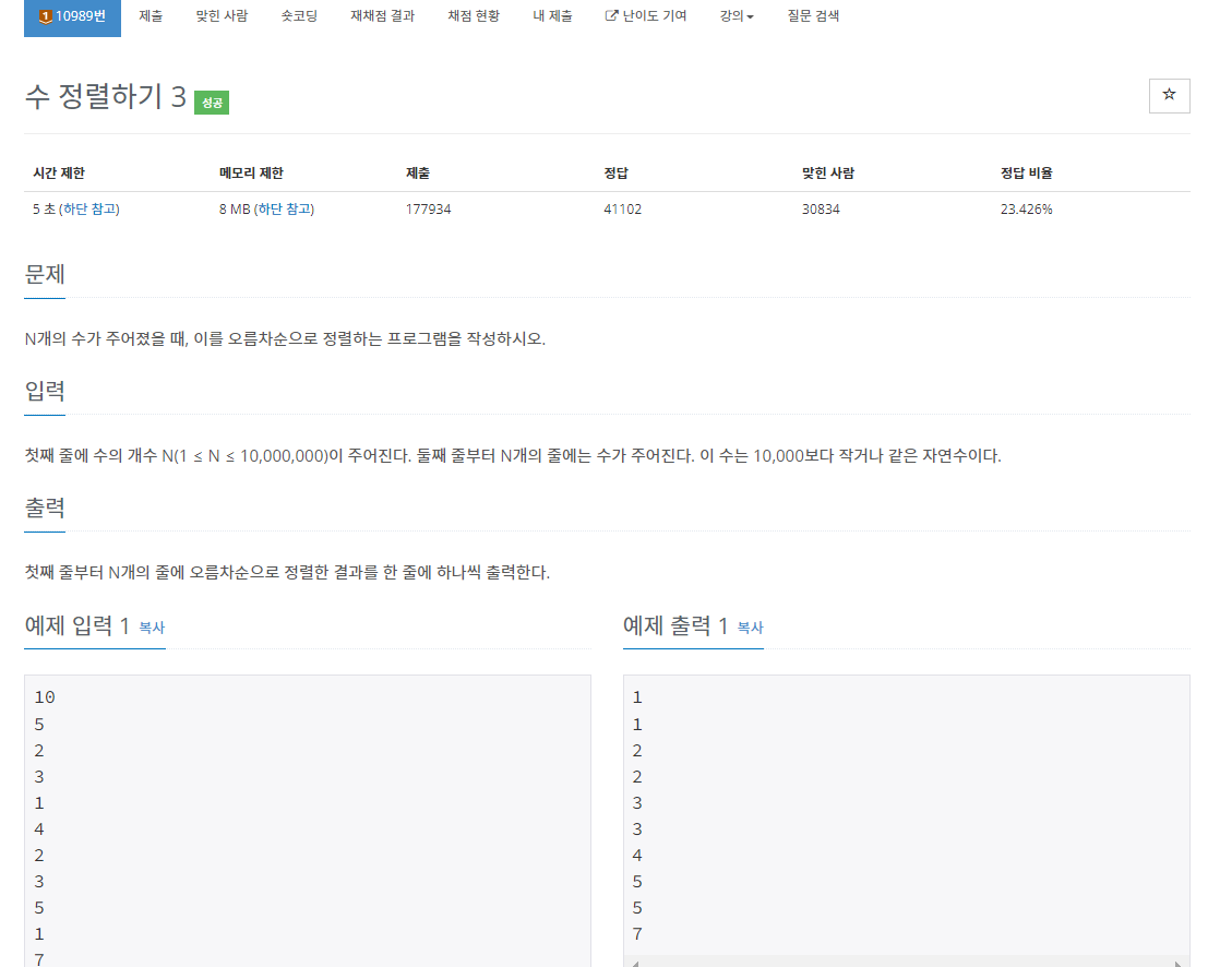 백준 10989번 수 정렬하기 3은 브론즈 1 난이도의 정렬 문제이다. 이 문제는 되게 간단하다. N개의 수가 주어지고 이 N개의 수를 오름차순으로 정렬을 해서 그대로 출력만 해주기만 하면 된다.