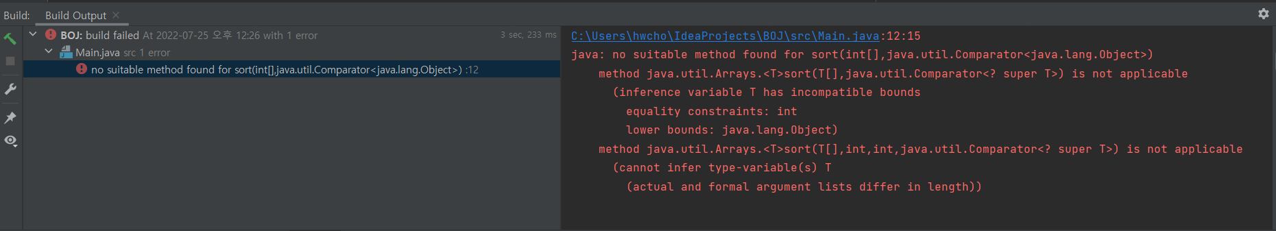 즉, java: no suitable method found for sort(int[],java.util.Comparator<java.lang.Object>) 에러가 뜬다. 이 오류가 생기는 이유는 int형 배열로는 Collections.reverseOrder()를 사용할 수 없기 때문이다. 이 에러를 해결하려면 배열을 Integer 형으로 만들어 주면 된다.