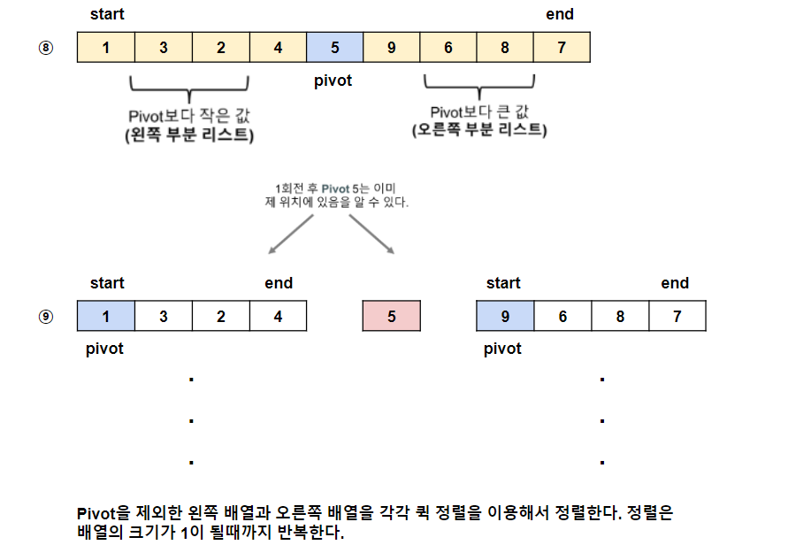 - 분할된 영역에서 맨 앞에 있는 수를 pivot으로 설정하고 같은 과정을 수행한다