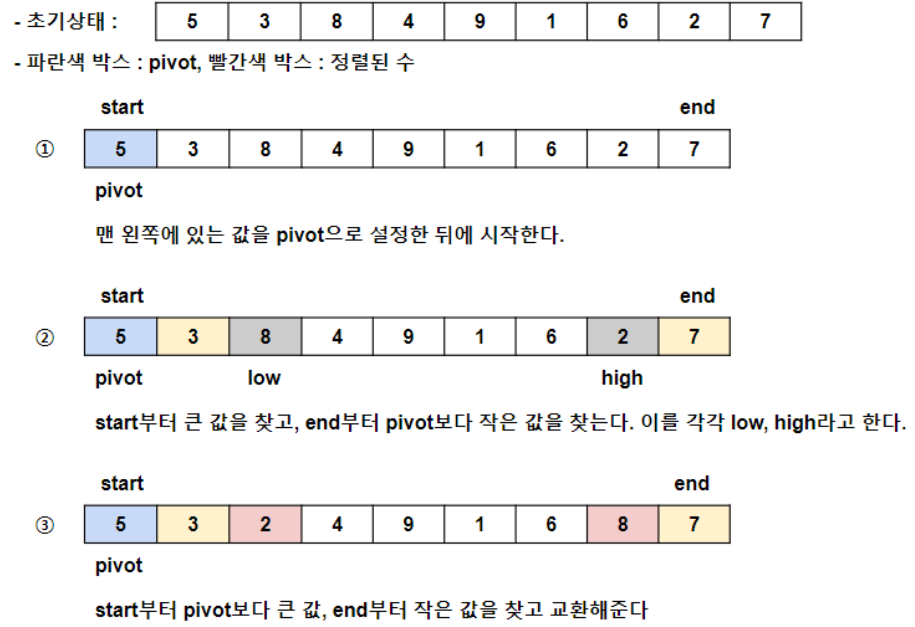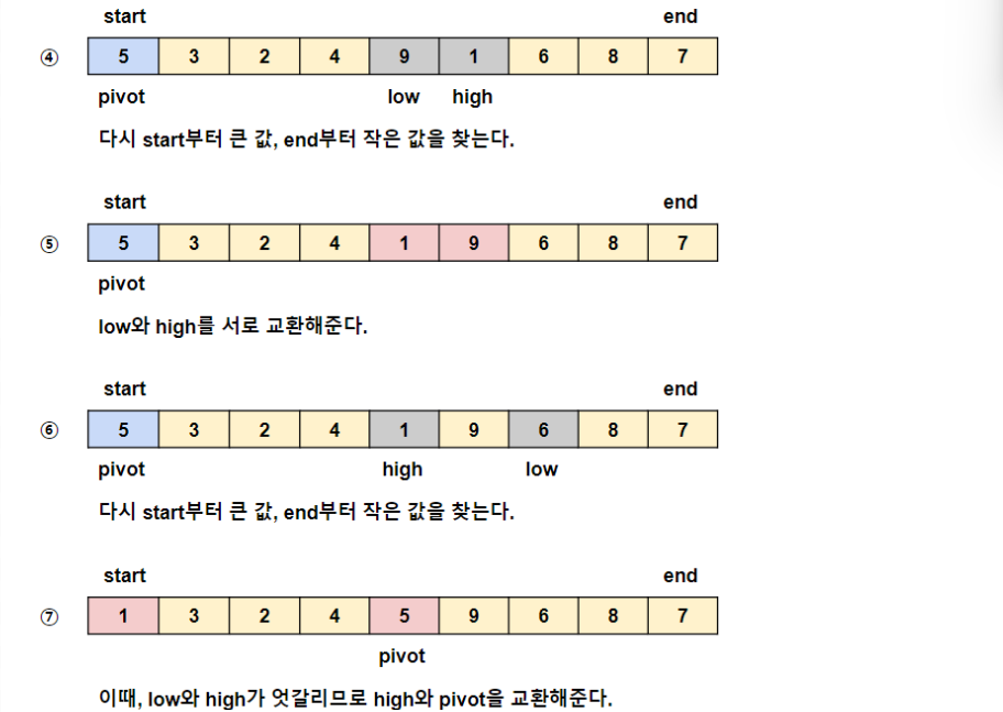 - pivot 값을 기준으로 시작점에서부터 검사해서 큰 값을, 도착점에서부터 작은 값을 찾는다.