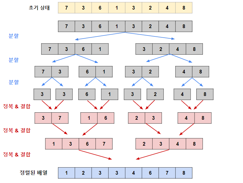병합 정렬은 분할 정복의 다음과 같은 과정을 거친다.