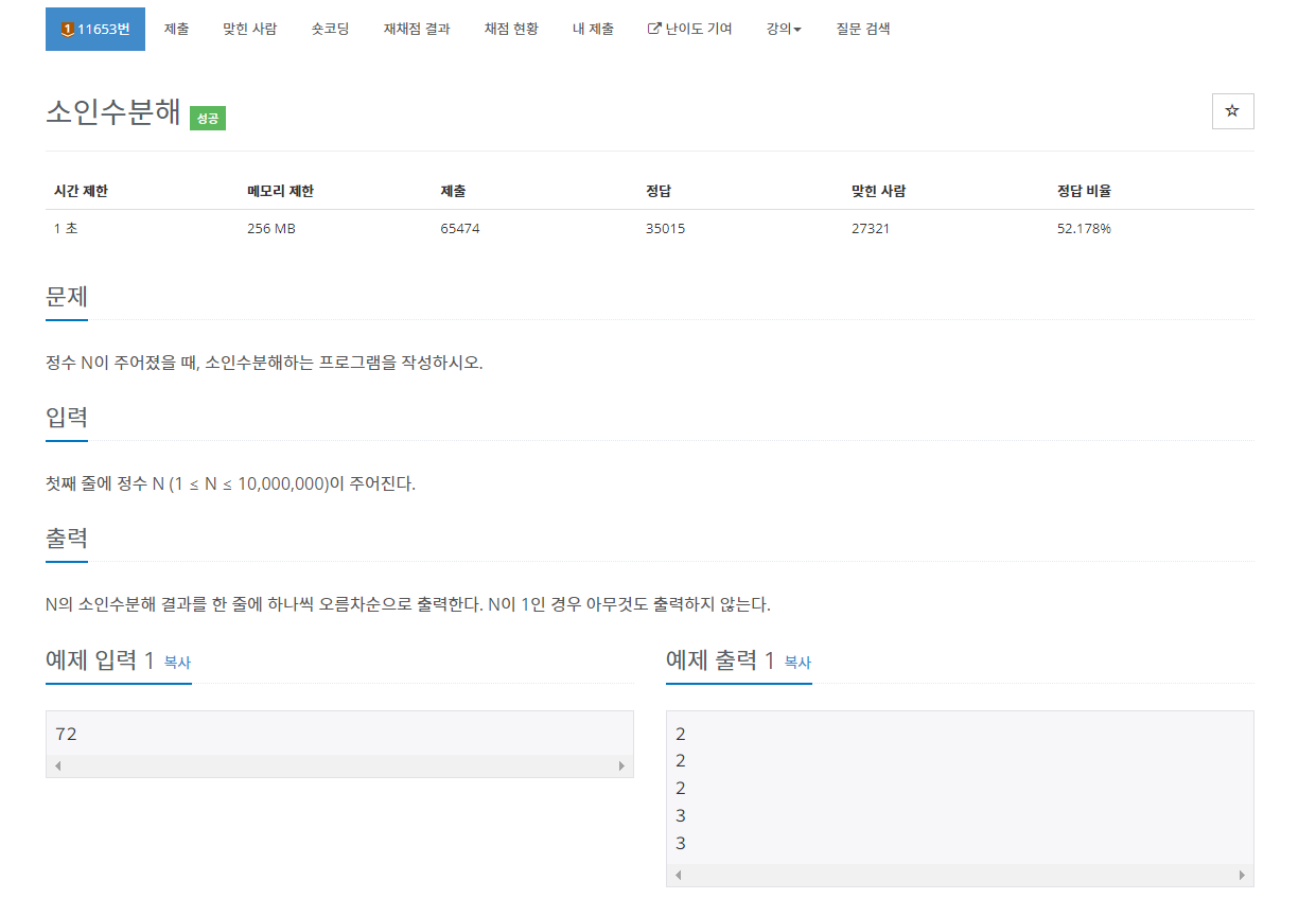백준 11653번 소인수분해는 브론즈 1 난이도의 수학 문제이다. 이 문제는 되게 간단하다. 숫자 N이 주어졌을 때 이 N을 소인수 분해한 결과를 출력하면 된다. 예를 들어서 6이 주어지면 2와 3을 출력하면 된다.
