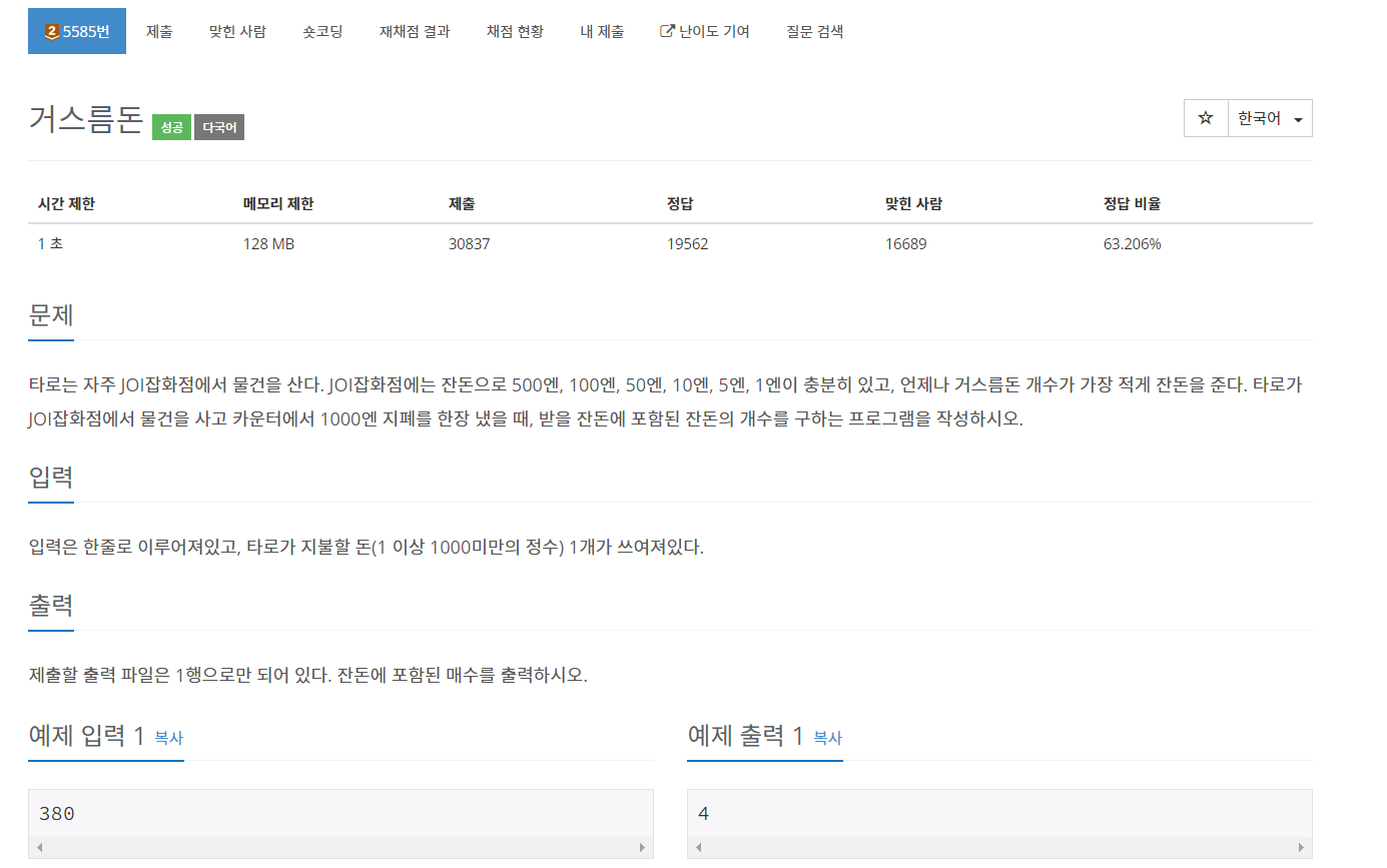 백준 5585번 거스름돈은 브론즈 2 난이도의 그리디 문제이다. 이 문제에서는 가격 N이 주어진다. 그리고 항상 1000엔짜리 지폐로 계산하고 거스름돈은 500엔, 100엔, 50엔, 10엔, 5엔, 1엔으로 받을 수 있다. 이때 최소의 개수로 거스름돈을 받는다고 할 때 받는 거스름돈의 매수를 출력하면 된다.