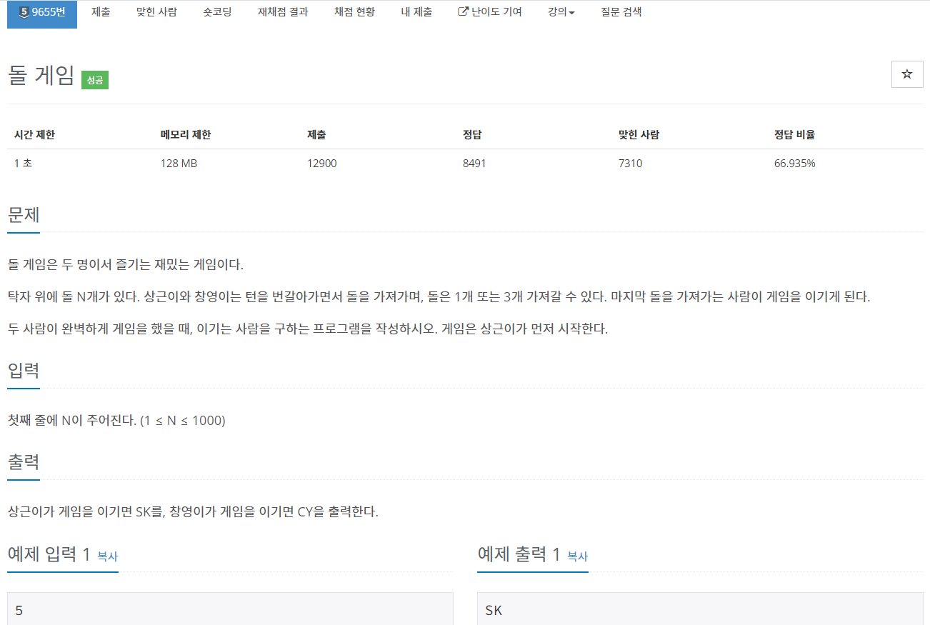 이 문제에서는 상근이와 창영이가 턴을 번갈아가면서 돌을 가져가며, 돌은 1개나 3개를 가져갈 수 있다. 그리고 마지막 돌을 가져가는 사람이 게임을 이기게 되고 돌 n개가 있을 때 누가 이기는 지를 구하면 되는 실버 5 난이도의 DP 문제이다.