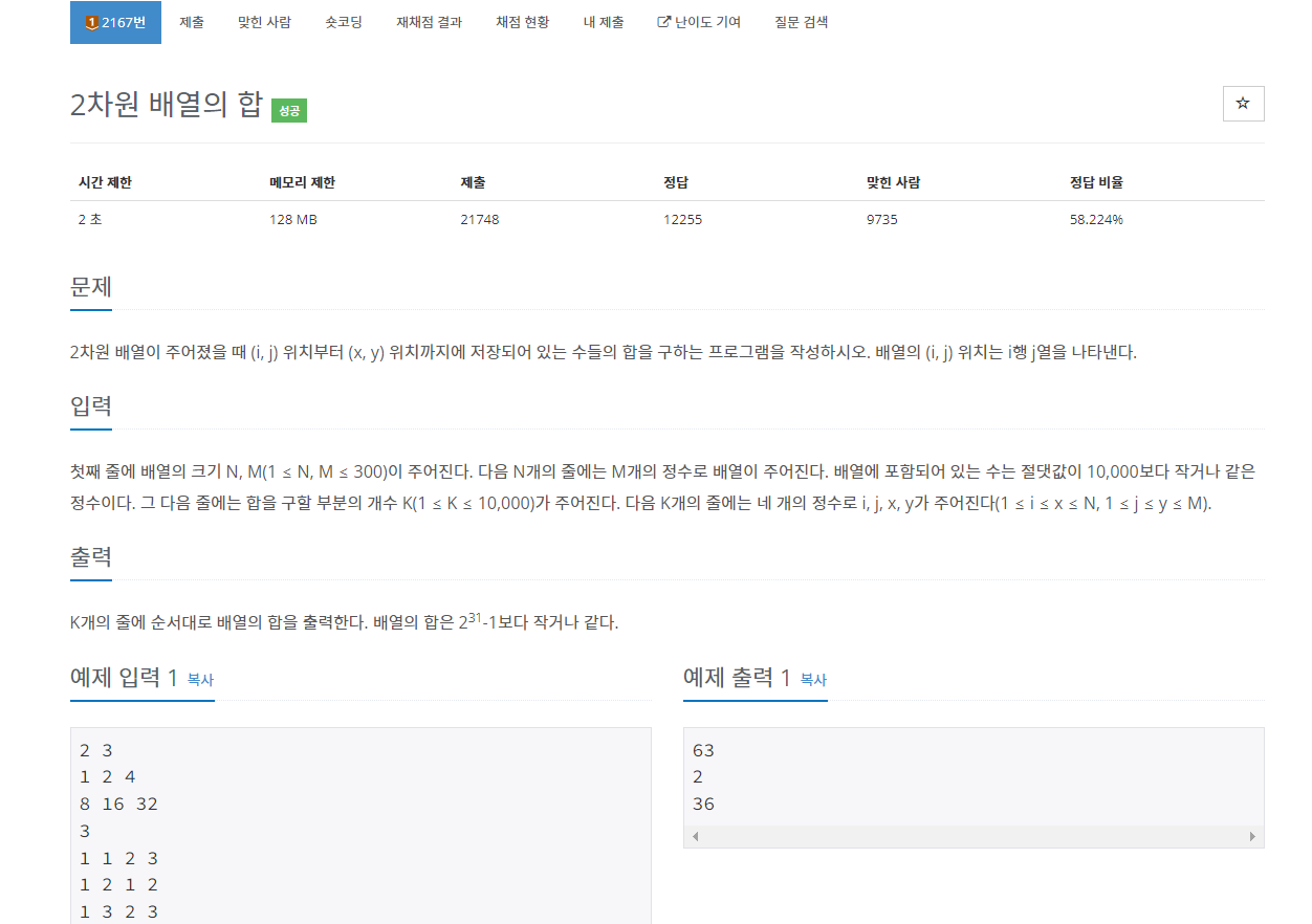 백준 2167번 2차원 배열의 합은 브론즈 1 난이도의 구현 문제이다. 이 문제는 배열이 주어지고 (i, j)와 (x, y)가 같이 주어졌을 때 (i, j)부터 (x, y)까지의 합을 구하면 된다.