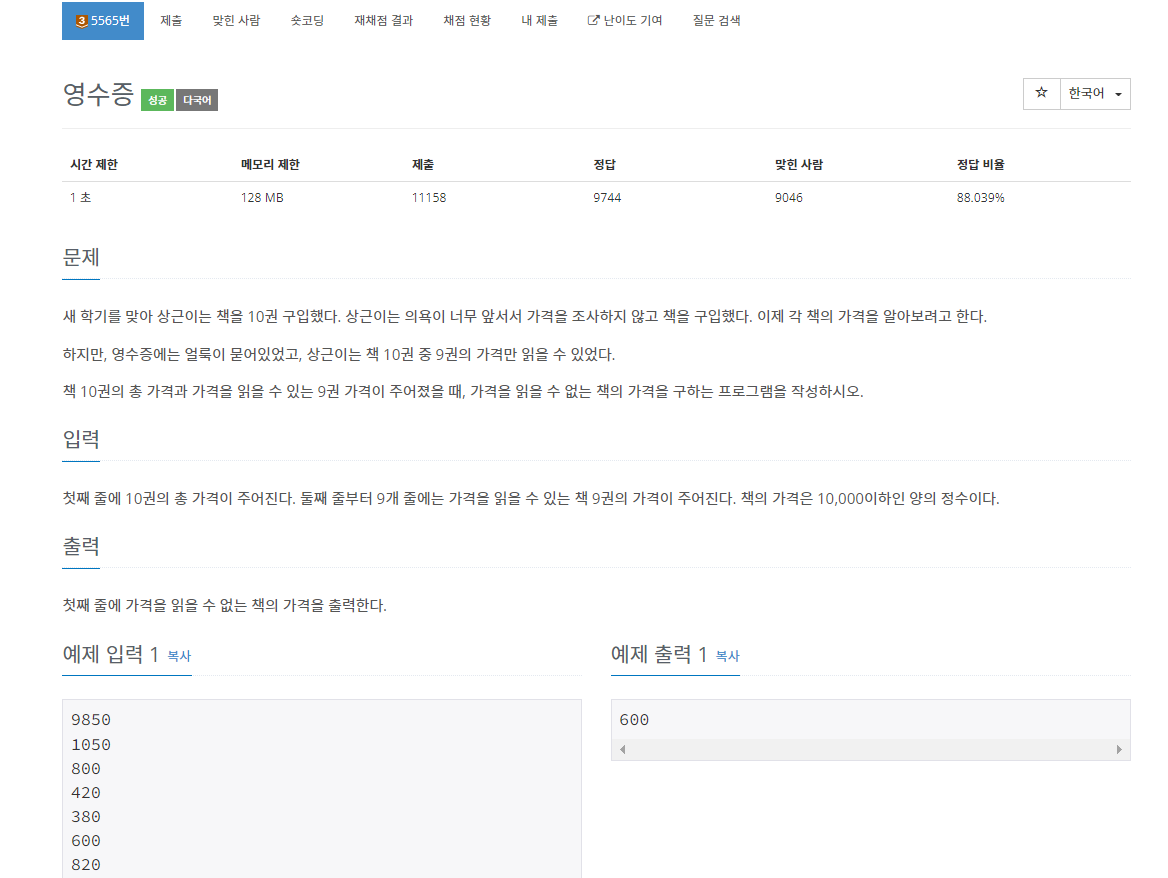 백준 5565번 영수증은 브론즈 3 난이도의 수학 및 구현 문제이다. 이 문제에서는 10개의 물건들의 총가격이 주어지고 나머지 9개 물건들의 가격이 각각 주어진다. 이때, 나머지 물건의 가격을 구하면 된다. 추가로 이 문제는 Japanese Olympiad in Informatics Qualification Round 2010 예선 1번으로 나온 문제이기도 하다.