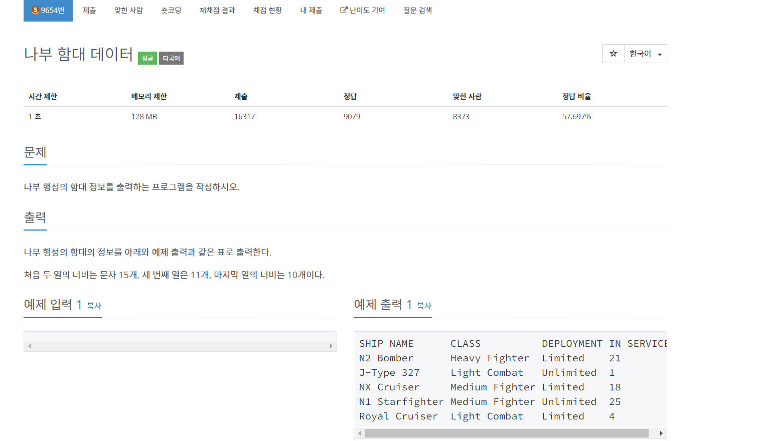 백준 9654번 나부 함대 데이터는 브론즈 5 난이도의 구현 문제이다.