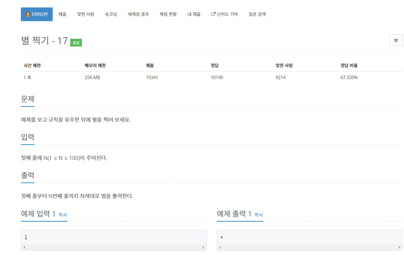 백준 10992번 별 찍기 - 17은 브론즈 3 난이도의 구현 문제이다. 이 문제는 문제에서 주어진 것처럼 출력하면 되는 문제이다.