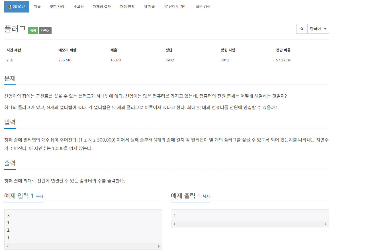 백준 2010번 플러그는 브론즈 3 난이도의 수학 및 구현 문제이다. 이 문제에서는 멀티탭의 개수 N개가 주어지고 각각의 멀티탭마다 몇 개의 플러그를 꽂을 수 있는지 주어진다. 이때 총 몇 개의 컴퓨터를 연결시킬 수 있는지를 구하면 된다.