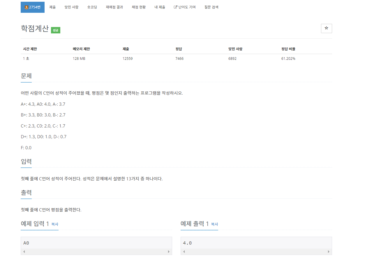 백준 2754번 학점계산은 브론즈 5 난이도의 구현 및 문자열 문제이다. 이 문제에서는 입력으로 성적이 주어지고 그 성적의 평점을 출력하면 된다.