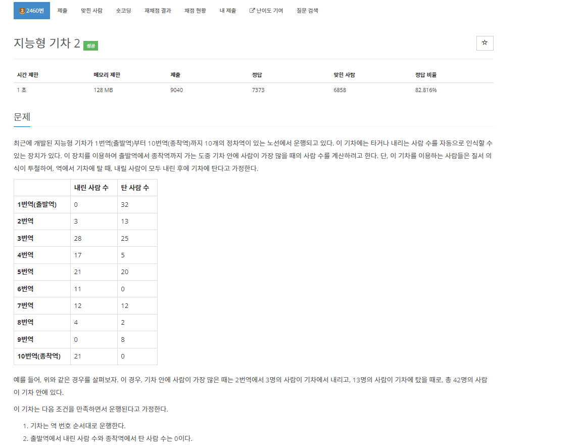 백준 2460번 지능형 기차 2는 브론즈 3 난이도의 수학 및 구현 문제이다. 이 문제에서는 10개의 역이 있다. 그리고 각각의 역에서 사람 N명이 내리고 M명이 탄다. 이때 출발역에서 종착역까지 가는 도중 기차 안에 사람이 가장 많을 때의 사람 수를 구하면 된다.
