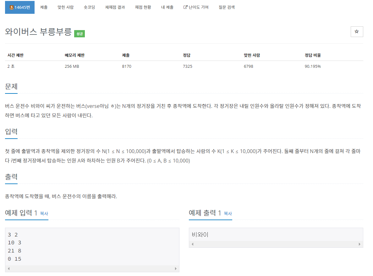 백준 14645번 와이버스 부릉부릉은 브론즈 5 난이도의 구현 문제이다. 이 문제에서는 종착역에 도착했을 때 버스 운전수의 이름을 출력하라고 나온다. 하지만 이 문제에서 버스 운전수의 이름이 주어지기 때문에 입력을 따로 받을 필요 없이 그냥 바로 "비와이"를 출력하면 된다.