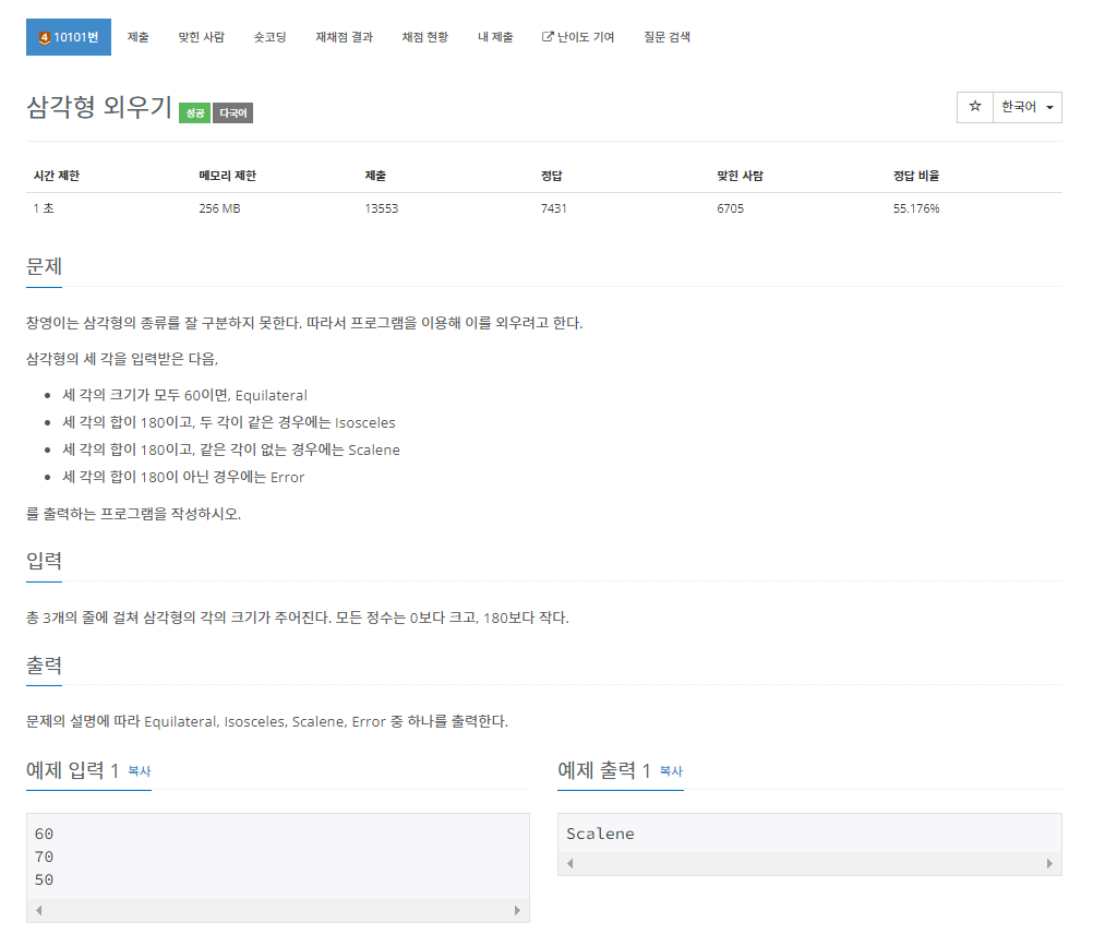 백준 10101번 삼각형 외우기는 브론즈 4 난이도의 구현 및 기하학 문제이다. 이 문제에서는 삼각형의 세 각이 주어진다. 그리고 이 삼각형이 정삼각형인지, 이등변 삼각형인지, 부등변 삼각형인지, 아니면 삼각형이 아닌지 출력하면 된다.
