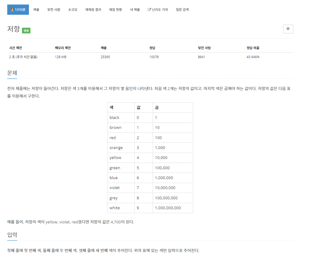 백준 1076번 저항은 브론즈 2 난이도의 구현 문제이다. 이 문제에서는 입력으로 3개의 색깔이 주어진다. 그리고 첫 두 색깔을 합친 수와 마지막 색깔의 수를 곱하면 된다.