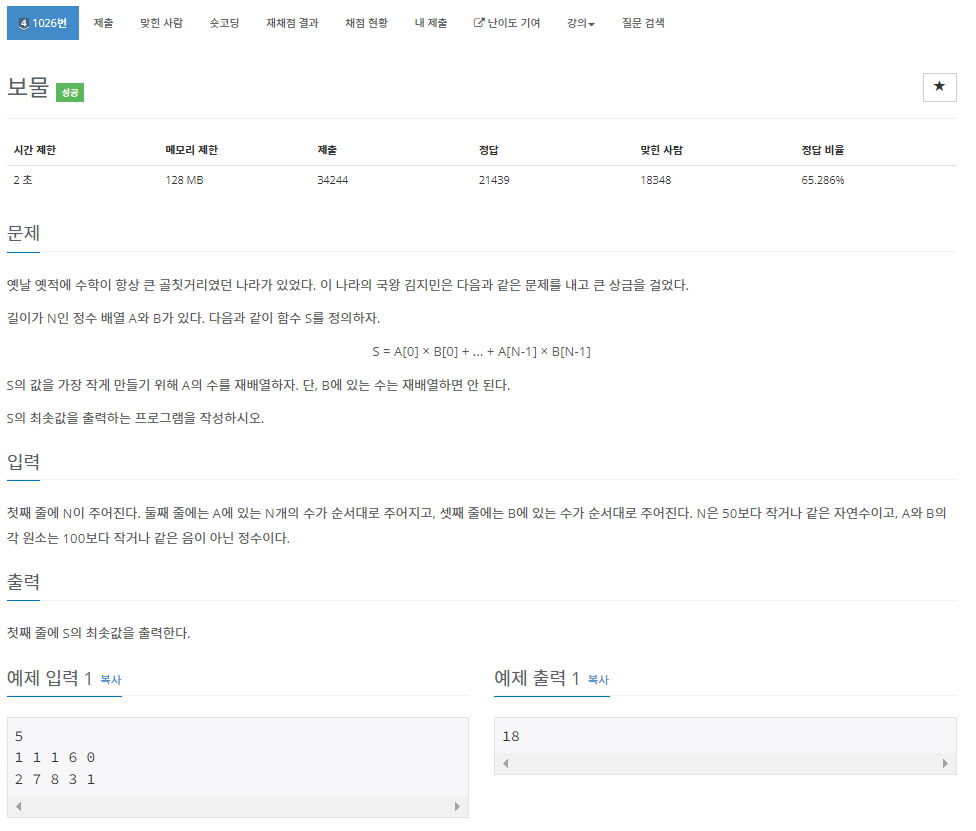 백준 1026번 보물은 실버 4 난이도의 sorting을 이용해서 푸는 문제이다.