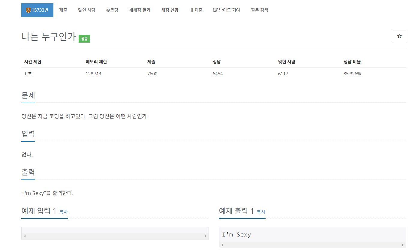 백준 15733번 나는 누구인가는 브론즈 5 난이도의 구현 문제이다. 이 문제는 되게 간단하다. 예제 출력에 나와있는 내용을 그대로 복사해서 출력만 해주면 된다.