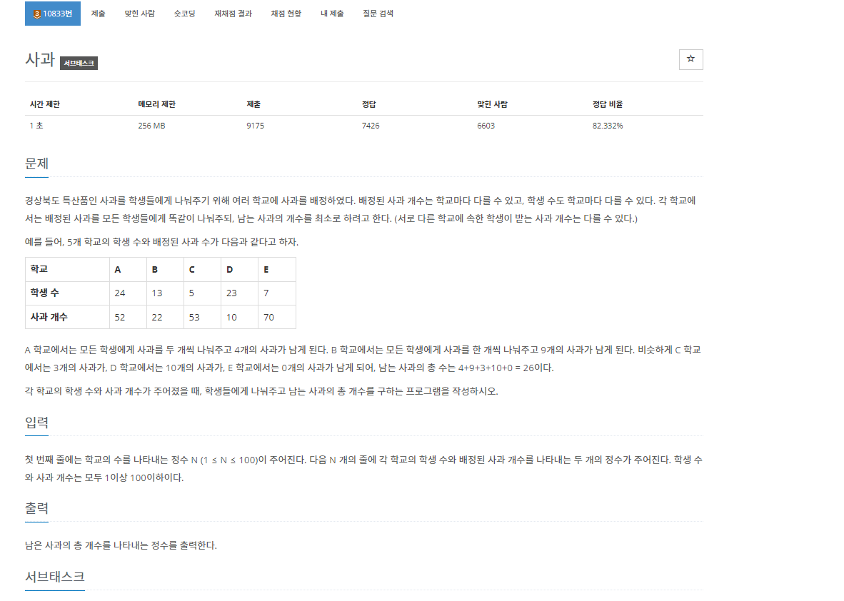 백준 10833번 사과는 브론즈 3 난이도의 수학 문제이다. 이 문제에서는 학교의 개수 N이 주어진다. 그리고 N 줄에 걸쳐 학생 수와 사과의 수가 입력으로 주어진다. 사과는 모든 학생들에게 똑같이 나눠줘야 되고 남는 사과들의 합을 구하면 된다.