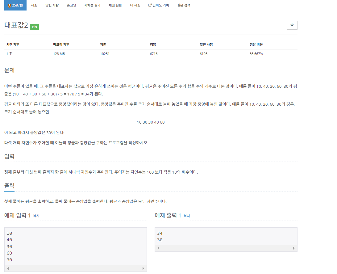 백준 2587번 대표값2는 브론즈 2 난이도의 수학 및 구현 문제이다. 이 문제에서는 5개의 숫자가 주어지고 이 5개의 숫자의 평균값과 중앙값을 출력하면 된다.