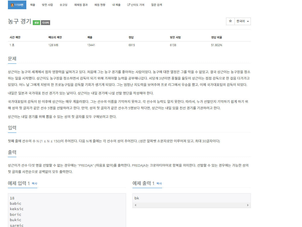 백준 1159번 농구 경기는 브론즈 2 난이도의 구현 및 문자열 문제이다. 이 문제에서는 선수의 수 N명이 주어지고 N명의 선수 이름들이 입력으로 주어진다. 선수 이름의 첫 글자가 똑같은 사람이 5명이 넘으면 선수를 선발할 수 있다. 이때, 선수를 선발할 수 없으면 PREDAJA를 출력하고 선발할 수 있으면 선발 가능한 이름의 첫 글자를 사전 순으로 출력하면 된다.