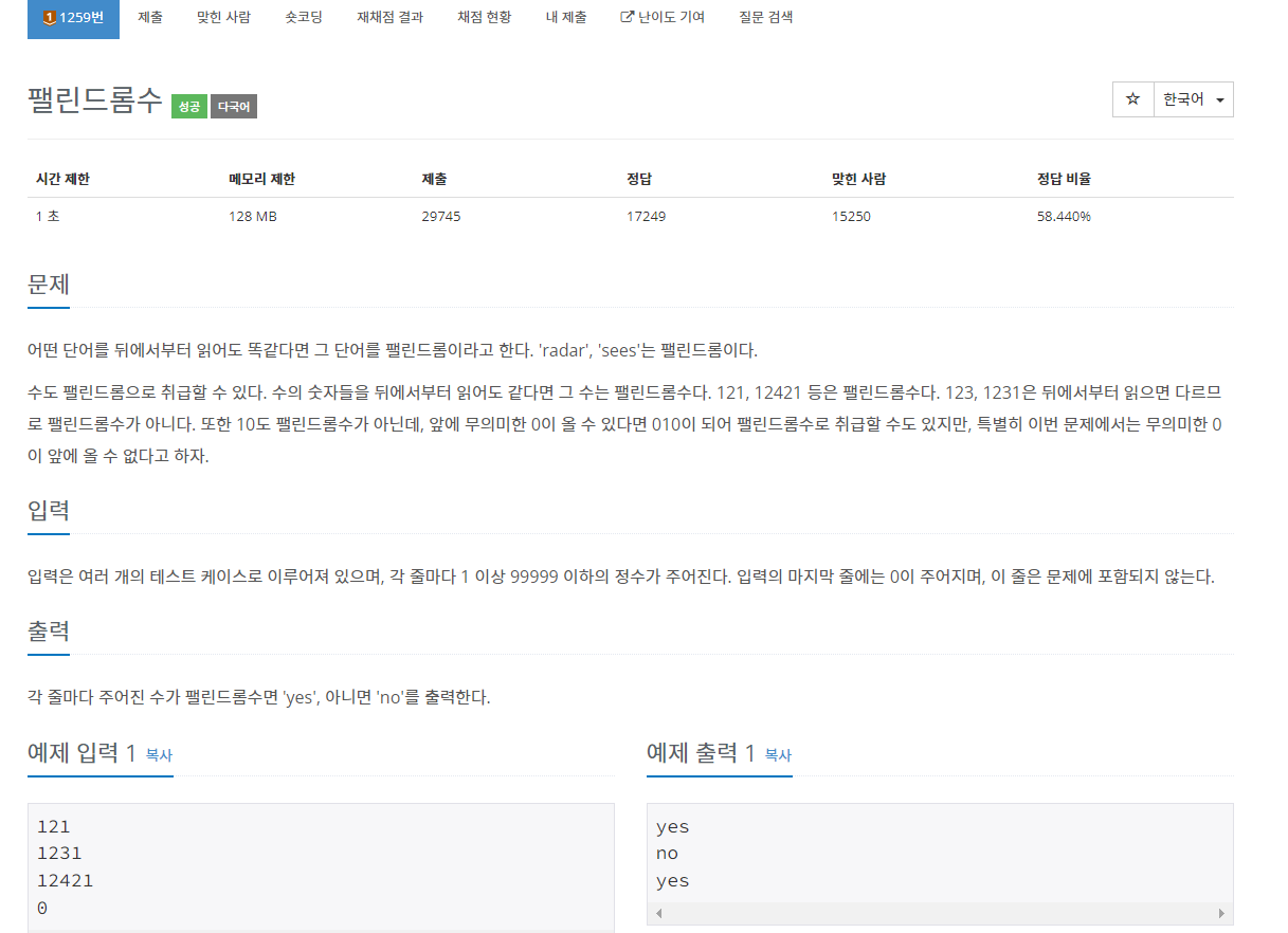백준 1259번 팰린드롬수는 브론즈 1 난이도의 구현 및 문자열 문제이다. 이 문제에서는 숫자들이 주어지고 그 숫자가 팰린드롬인지 아닌지 출력하면 되는 문제이다. 팰린드롬이란 수의 숫자들을 뒤에서부터 읽어도 같은 경우를 뜻한다. 한 예로는 121이 있다.