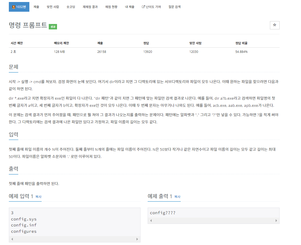 이 예시에서는 3개의 파일 이름들이 주어졌다. 그리고 config 까지만 똑같고 마지막 4개의 단어들이 다르다. 따라서 config????를 출력해주면 된다.