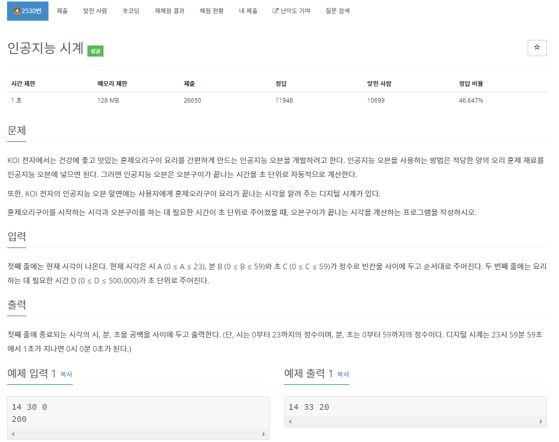 백준 2530번 인공지능 시계는 브론즈 4 난이도의 수학 문제이다. 이 문제에서는 현재 시각이 A시 B분 C초의 형태로 주어진다. 그리고 요리하는 데 필요한 시간 D가 초 단위로 주어진다. 이때, 요리가 끝났을 때의 시간을 구하면 된다. 단, 23시 59분 59초에서 1초가 지나면 0시 0분 0초가 된다.