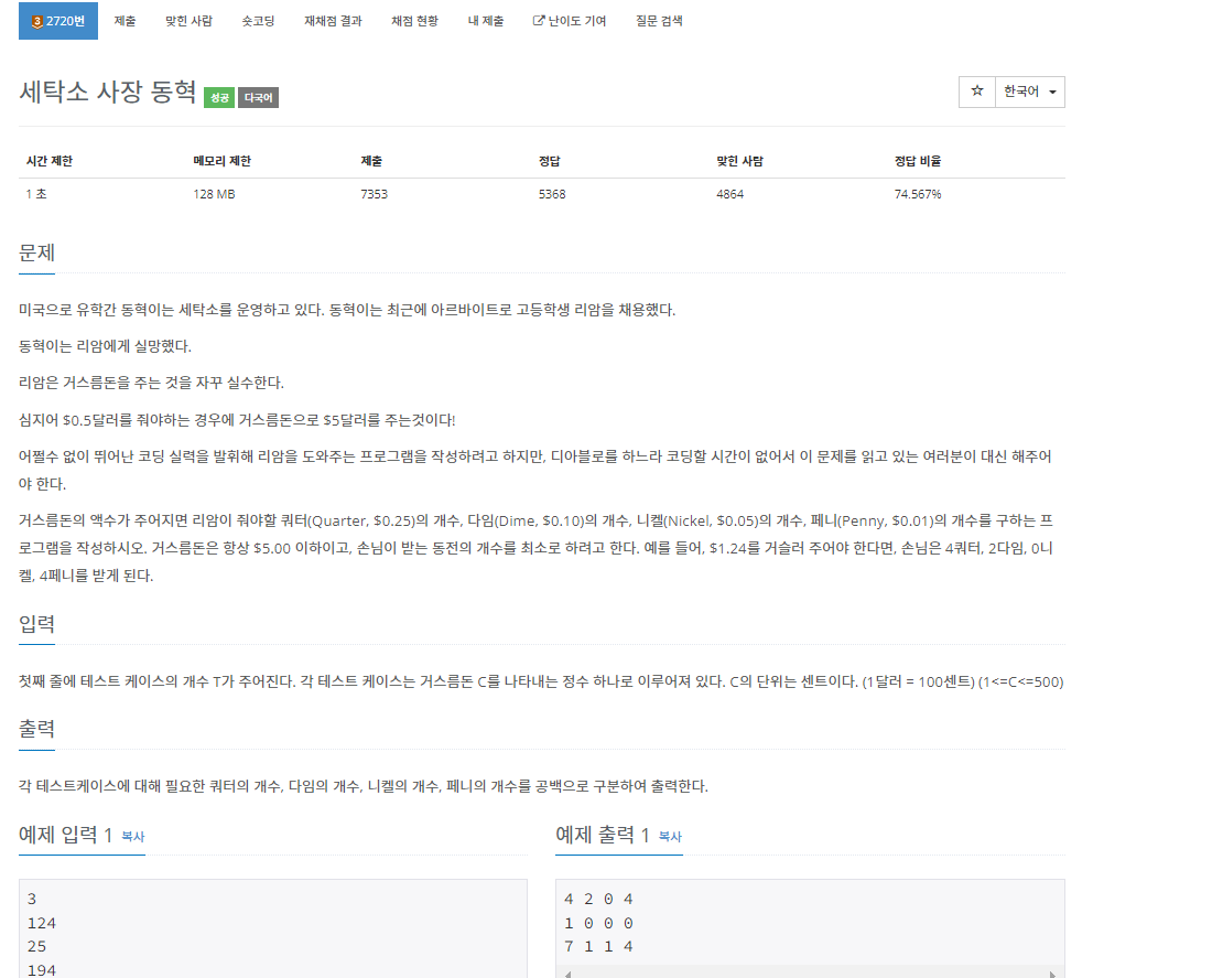 백준 2720번 세탁소 사장 동혁은 브론즈 3 난이도의 수학 및 그리디 문제이다. 이 문제에서는 거스름돈의 액수가 주어진다. 이때, 줘야 할 쿼터의 개수, 다임의 개수, 니켈의 개수와 페니의 개수를 구하면 된다.