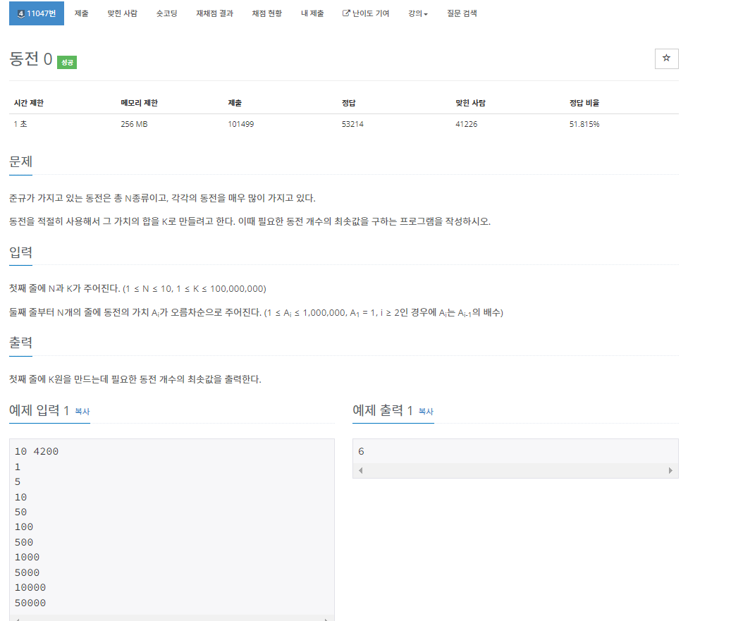 백준 11047번 동전 0은 실버 4 난이도의 그리디 문제이다. 이 문제에서는 동전의 종류 개수 N개와 이 동전들을 이용해서 만들어야 하는 총 합 K가 주어진다. 그리고 입력으로 동전의 가치들이 오름차순으로 주어진다. 이때, K원을 만드는데 필요한 최소 동전 개수를 구하면 된다.