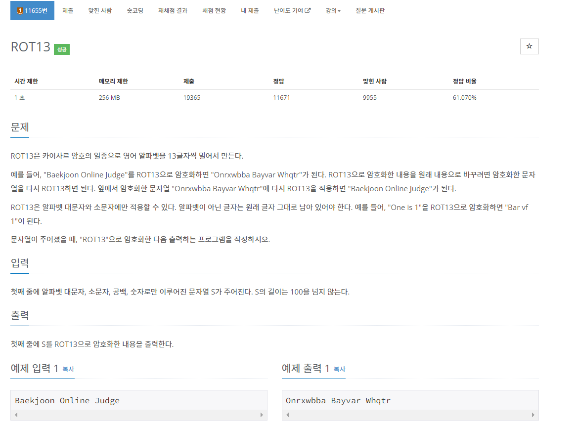 백준 11655번 ROT13은 브론즈 1 난이도의 구현 및 문자열 문제이다. 이 문제에서는 문자열이 주어졌을 때 "ROT13"으로 암호화한 내용을 출력하면 된다.