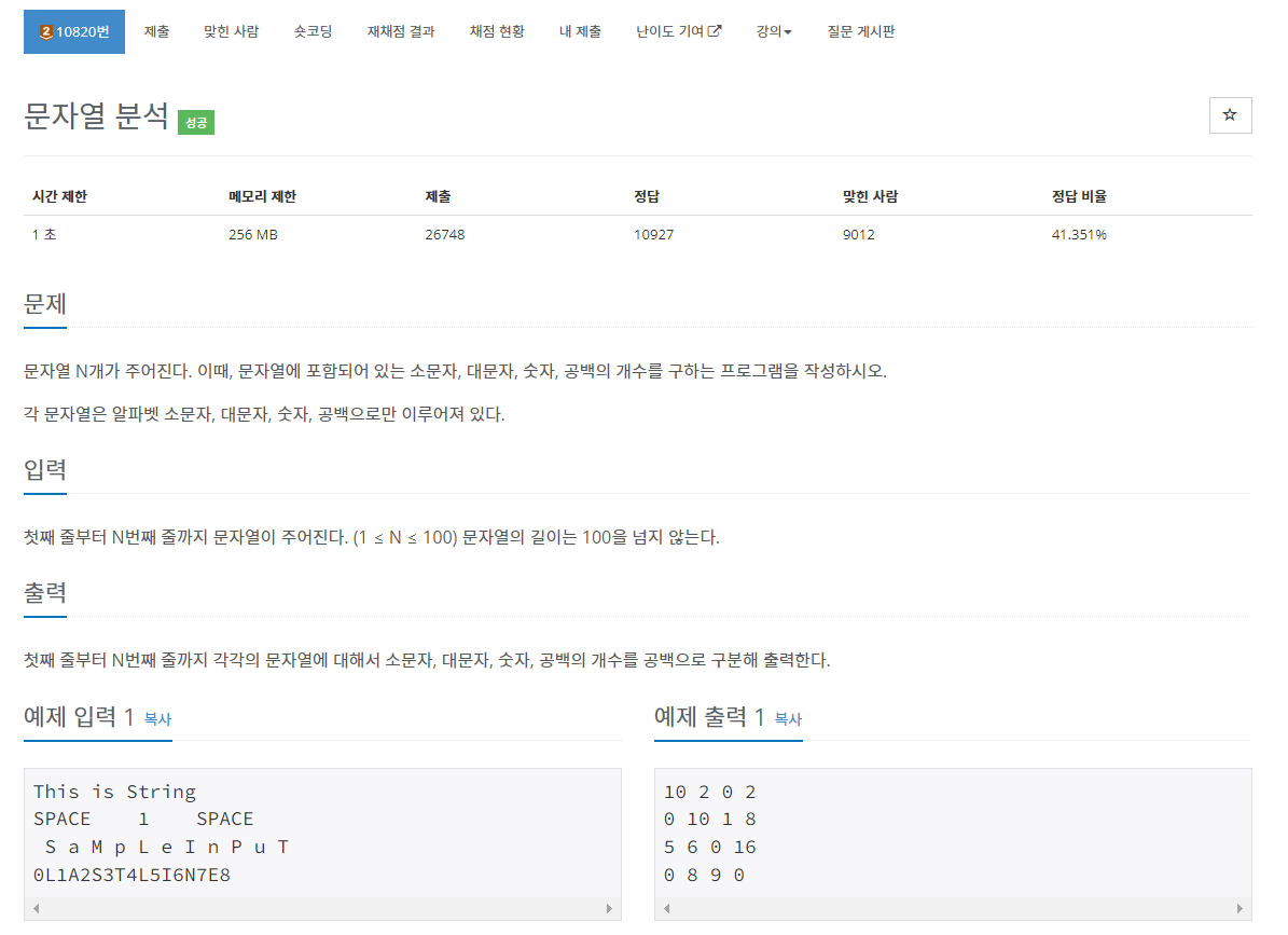 10820번: 문자열 분석