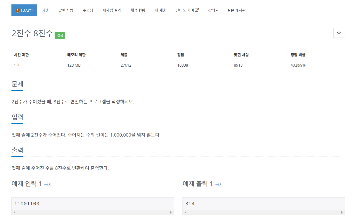 백준 1373번 2진수 8진수는 브론즈 1 난이도의 수학 및 문자열 문제이다. 이 문제에서는 2진수가 하나 주어지고 이 2진수를 8진수로 변환시키면 된다.