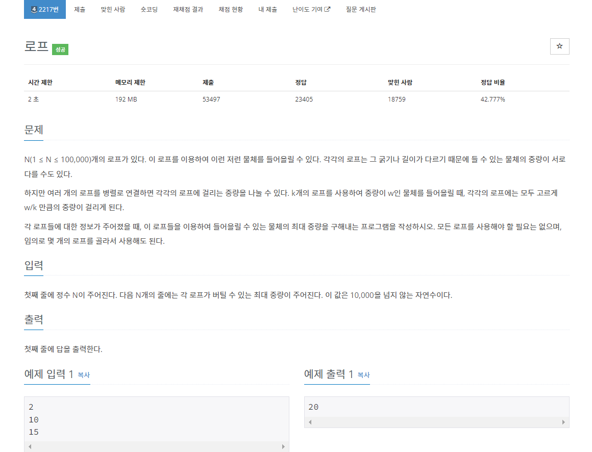 백준 2217번 로프는 실버 4 난이도의 수학 및 그리디 문제이다. 이 문제에서는 들 수 있는 물체의 중량이 다를 수 있는 로프 N개가 주어진다. 그리고 로프를 병렬로 연결하면 로프에 걸리는 중량을 나눌 수 있다. 이 문제에서 k개의 로프를 사용하여 중량이 w인 물체를 들어 올릴 때, 각각의 로프에는 모두 고르게 w/k 만큼의 중량이 걸리게 된다고 주어졌다. 이때 로프 N개가 주어지고 각각 로프마다 들 수 있는 무게가 주어질 때 이 로프들을 이용해서 들 수 있는 최대 무게를 구하면 된다.