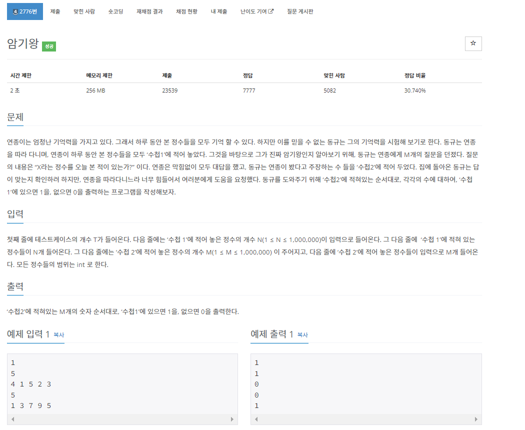 백준 2776번 암기왕은 실버 4 난이도의 자료 구조 및 해시 문제이다. 이 문제에서는 먼저 수첩 1에 있는 정수 N개가 주어지고 그다음에 수첩 2에 있는 정수 M개가 주어진다. 이때, 수첩 2에 있는 숫자들 중에서 수첩 1에도 있으면 1을 출력하면 되고, 없으면 0을 출력하면 된다.