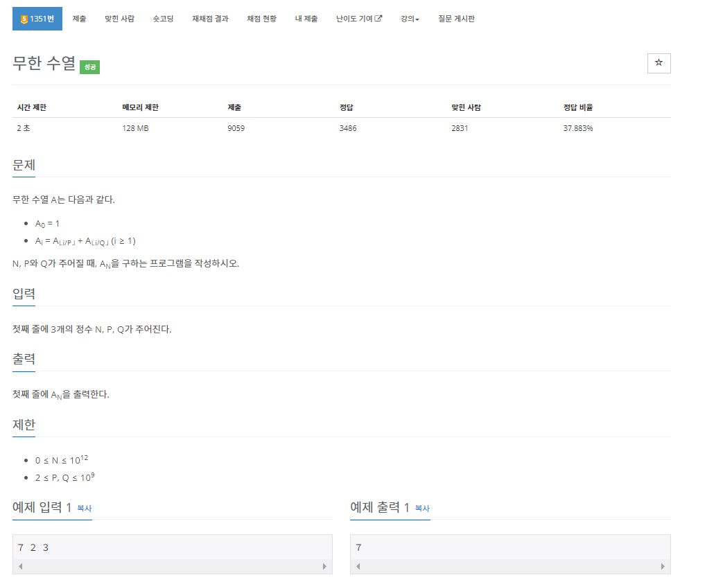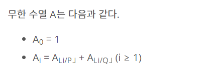 백준 1351번 무한 수열은 골드 5 난이도의 DP 및 해시 문제이다. 이 문제 자체는 되게 간단하다. 3개의 정수 N, P, Q가 주어지고 아래에 있는 공식을 써서 An을 구하면 된다.