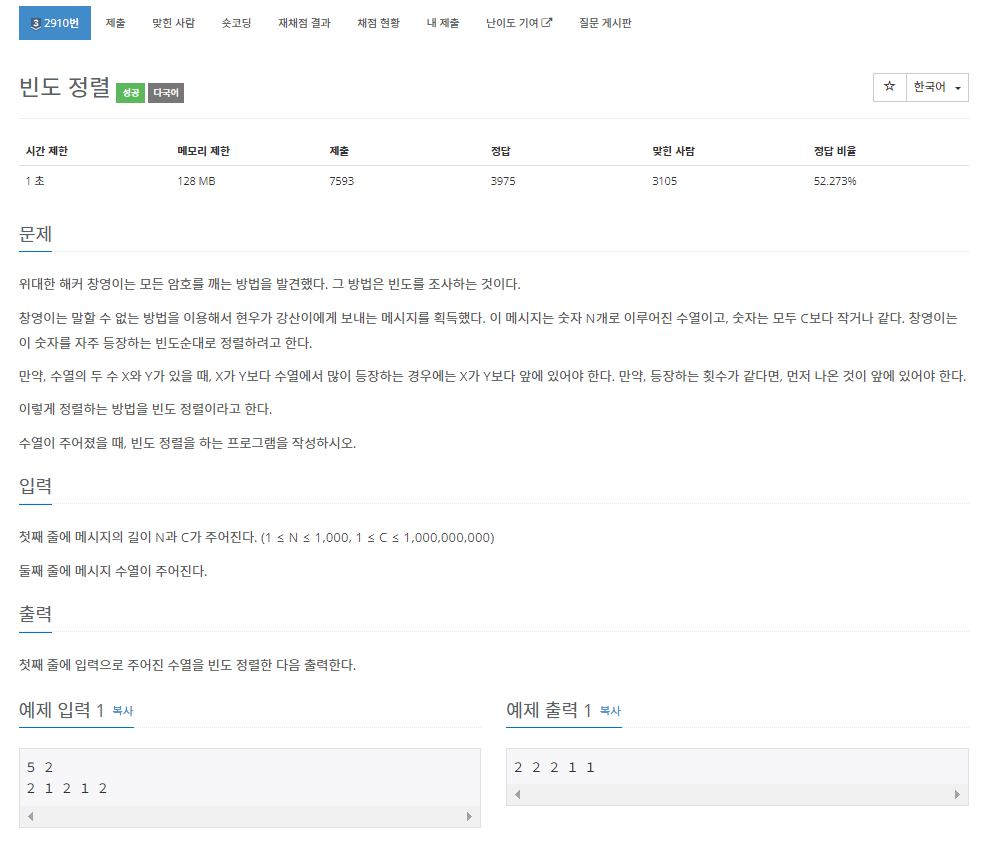 백준 2910번은 실버 3 난이도의 정렬 및 해시 문제이다. 이 문제에서는 숫자 N개가 주어진다. 이때, 이 숫자들을 가장 자주 등장하는 빈도수대로 정렬을 하면 된다. 추가로, 등장하는 횟수가 같으면 먼저 나온 숫자가 앞에 나오게 하면 된다.