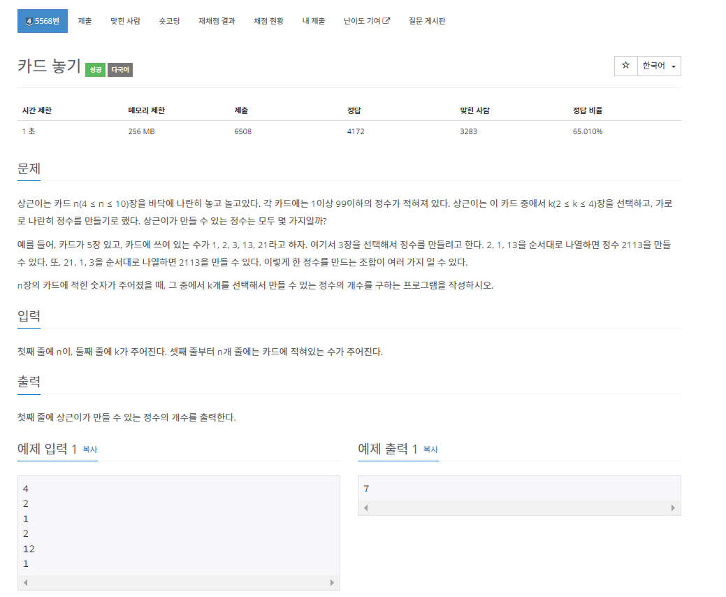 백준 5568번 카드 놓기는 실버 4 난이도의 브루트포스 및 해시 문제이다. 이 문제에서는 N개의 숫자들이 주어지고 K개의 숫자를 이용해서 몇 개의 숫자를 만들 수 있는지를 구하면 되는 문제이다.