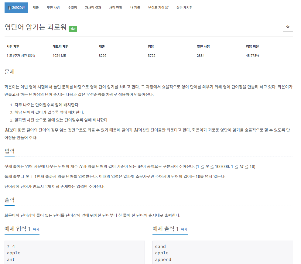 백준 20920번 영단어 암기는 괴로워는 실버 3 난이도의 해시 및 정렬 문제이다.