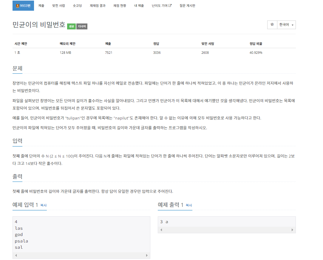 이 문제에서는 N개의 단어가 주어지고 이 중에서 민균이의 비밀번호를 찾으면 된다. 여기서 민균이의 비밀번호는 문자열이 있으면 이 문자여을 뒤집은 단어도 있는 게 민균이의 비밀번호다. N개의 단어 중에서 민균이의 비밀번호를 찾고 이 비밀번호의 길이와 가운데 글자를 출력하면 된다.