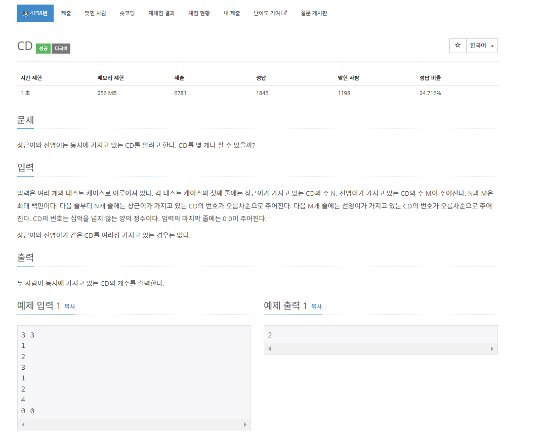 백준 4158번 CD는 실버 5 난이도의 자료 구조 및 두 포인터 문제이다. 이 문제에서는 상근이가 가지고 있는 CD의 수 N, 선영이가 가지고 있는 CD의 수 M이 주어진다. 이때 두 사람이 동시에 가지고 있는 CD의 개수를 출력하면 된다.