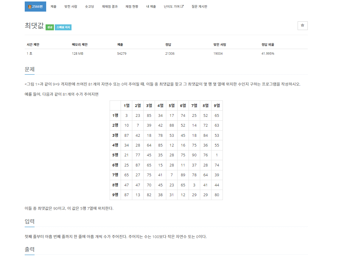 백준 2566번 최댓값은 브론즈 3 난이도의 구현 문제이다.