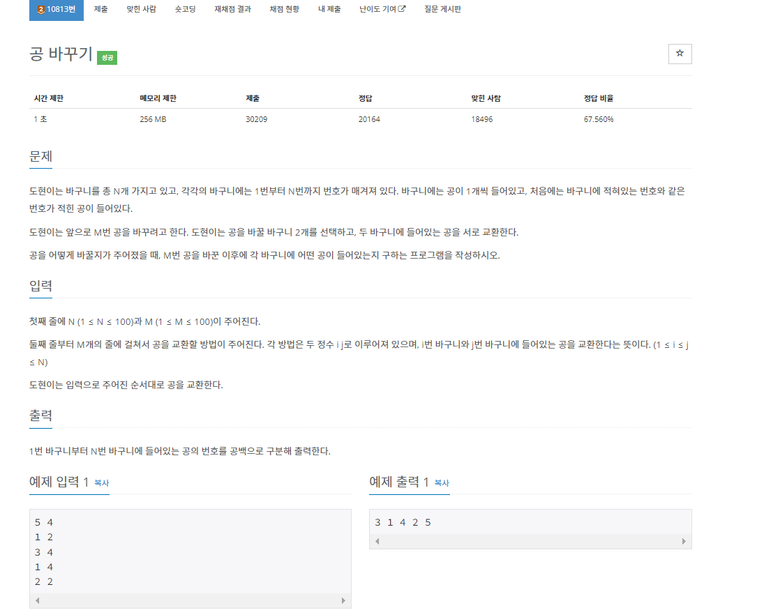 백준 10813번 공 바꾸기는 브론즈 2 난이도의 구현 및 시뮬레이션 문제이다.