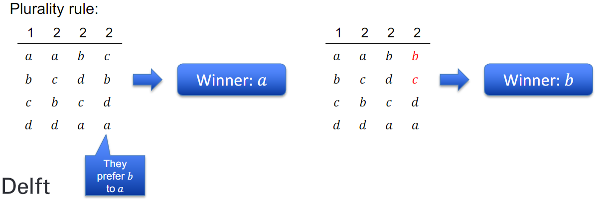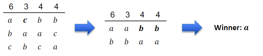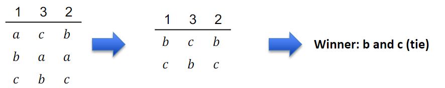 이 경우에서는 마지막에 있는 사람들은 b를 a보다 더 선호하므로 단합을 해서 투표를 바꿀 수도 있다. 이렇게 되면 a가 당첨이 안 되고 b가 당첨이 돼서 더 선호하는 결과가 된다 (Coalition).