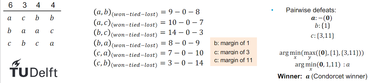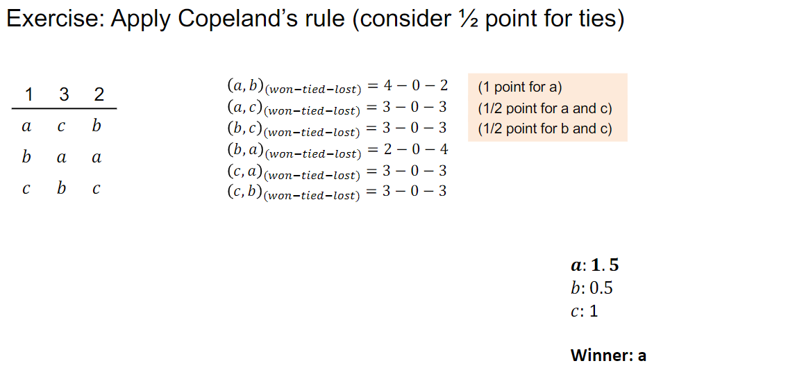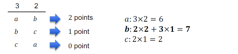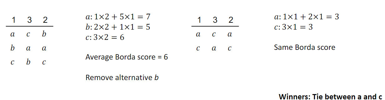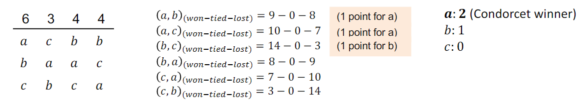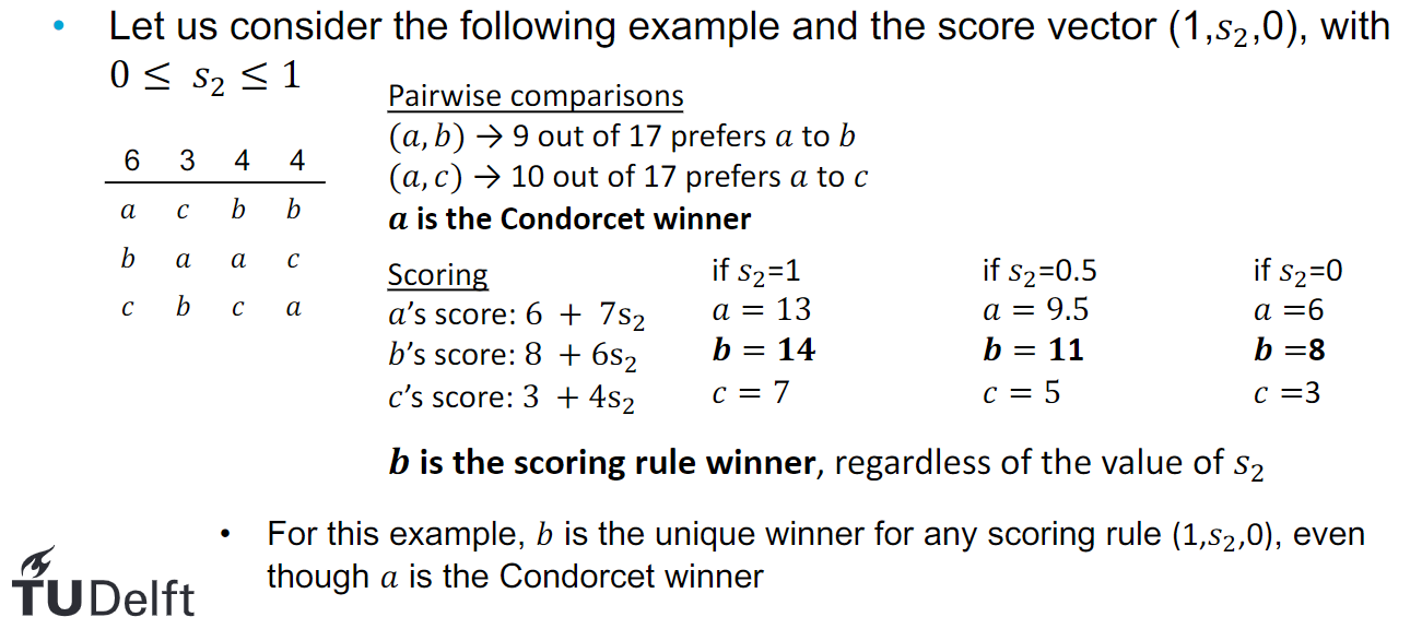 → 이 예시에서는 Scoring rule, 즉 Plurality (s2 = 0)나 Anti-plurality 방식을 썼을 때 b가 승자이다 (어떤 score vector를 사용하든 간에). 하지만, pairwise comparison, 즉 쌍별 비교를 하면 a가 b보다 더 선호되고 a가 c보다도 더 선호되기 때문에 a가 콩도르세 승자가 된다. 이 경우에도 Scoring rule을 썼을 때 승자와 콩도르세 승자가 다르다.