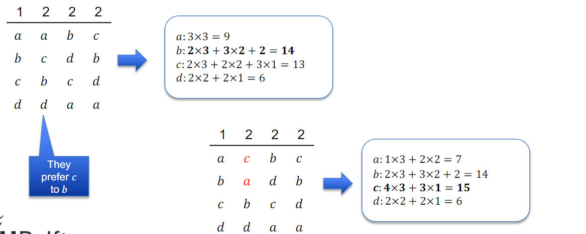 근데 Plurality rule 같은 경우에는 1등 선택지만 점수를 준다. 따라서, 2등 선택지나 다른 선택지는 아무 점수도 받지 못한다.