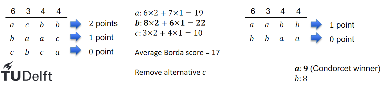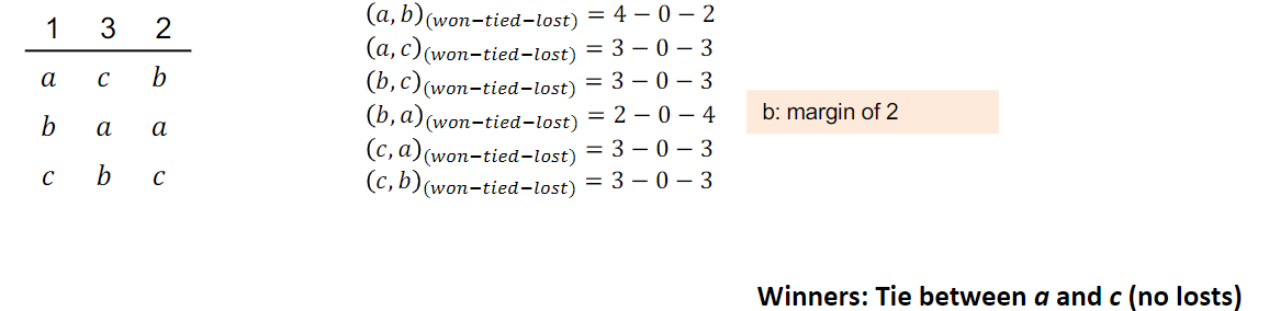 → 이 예시에서는 Scoring rule, 즉 Plurality (s2 = 0)나 Anti-plurality 방식을 썼을 때 b가 승자이다 (어떤 score vector를 사용하든 간에). 하지만, pairwise comparison, 즉 쌍별 비교를 하면 a가 b보다 더 선호되고 a가 c보다도 더 선호되기 때문에 a가 콩도르세 승자가 된다. 이 경우에도 Scoring rule을 썼을 때 승자와 콩도르세 승자가 다르다.