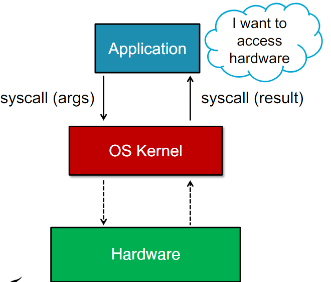 여기서 알아야 되는 것은 Application이 하드웨어 자원을 사용하려 할 때 커널에 syscall을 하고 이 커널이 컴퓨터 자원을 관리하기 때문에 그 결과값을 다시 syscall로 application에 전달한다.
