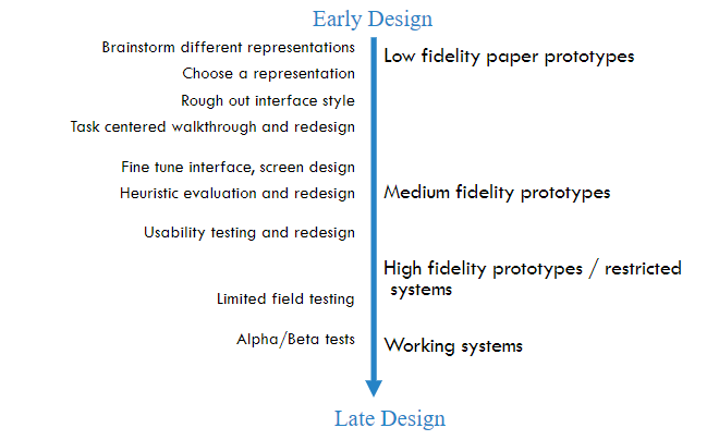 Early Design 단계에서는 low fidelity paper prototype으로 시작. 여기서는 아이디어들을 시각화하고 그다음에 medium fidelity prototype으로 이동. 여기서는 사용성 테스트를 하고 새롭게 디자인을 해서 high fidelity prototype. 여기서도 제한된 테스트들, 혹은 알파/베타 테스트를 거친 후 시스템이 완성된다.
