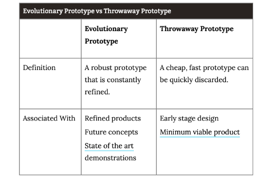 Throwaway prototype is used in early stage of design (e.g. when not sure what to do), often reflect minimum viable product