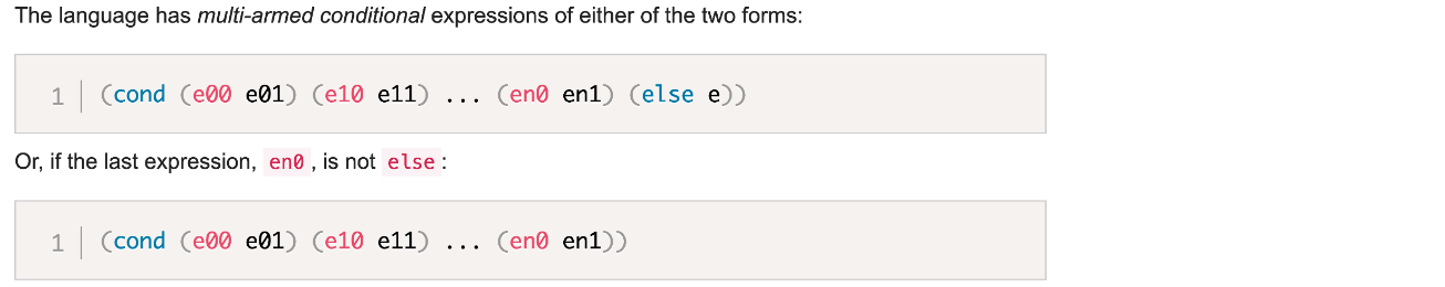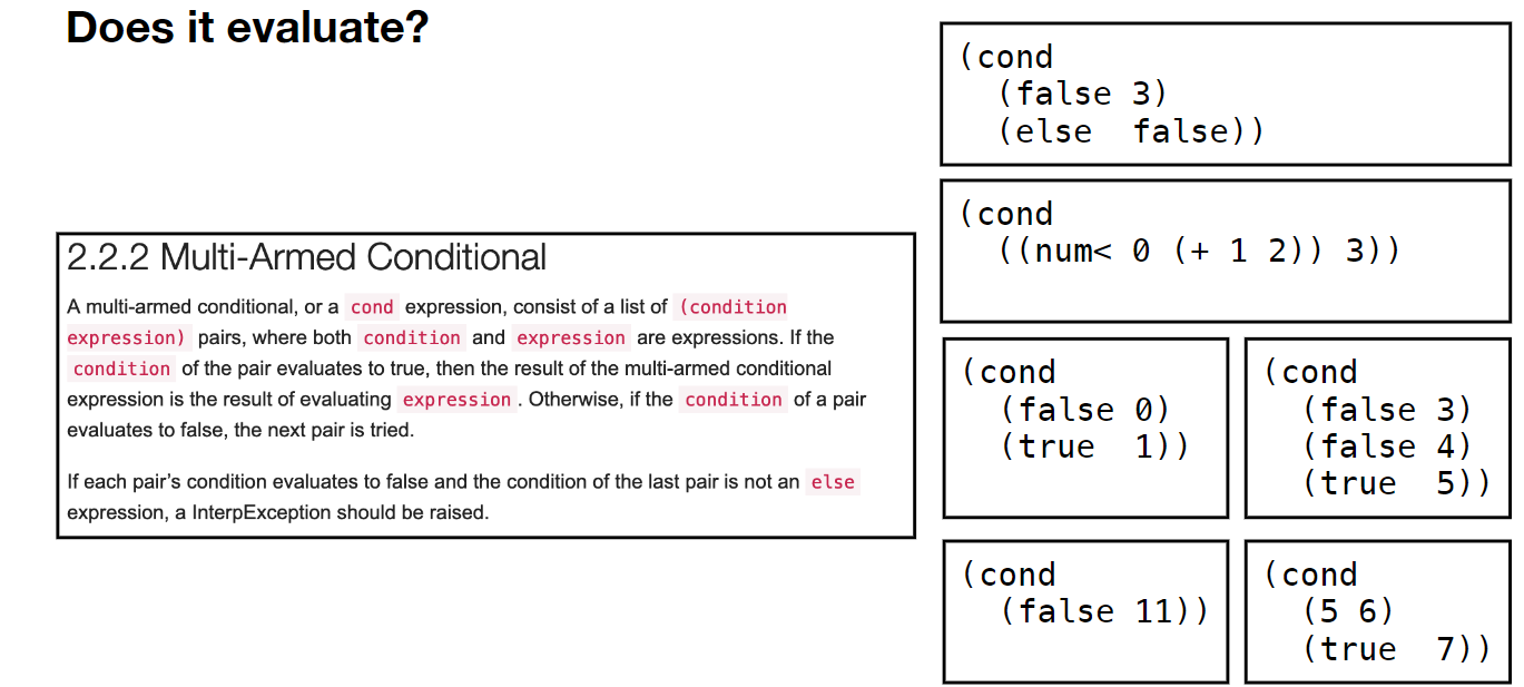 A multi-armed conditional, or a cond expression, consist of a list of (condition expression) pairs, where both condition and expression are expressions. If the condition of the pair evaluates to true, then the result of the multi-armed conditional expression is the result of evaluating expression. Otherwise, if the condition of a pair evaluates to false, the next pair is tried.